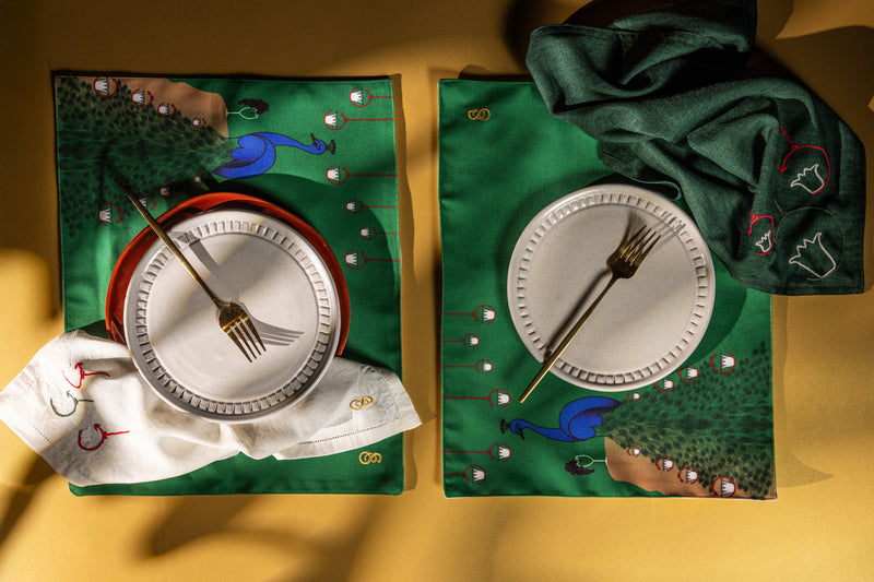 This is a set of 4 placemats and we pair them with either green embroderied RESTART napkins ( which you can find among the products in the collection. ) or pair them with the white embroderied RESTART napkins as shown in the photo.